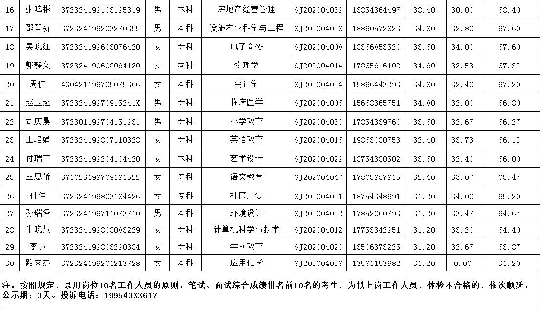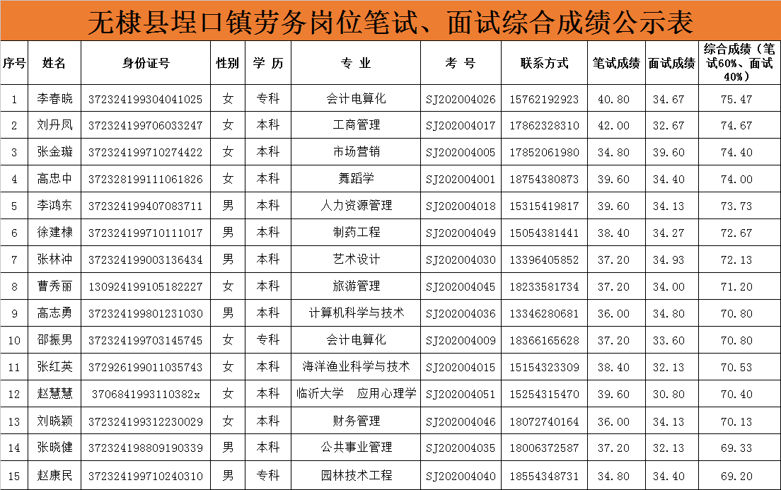 无棣县埕口镇劳务岗位笔试、面试综合成绩公示