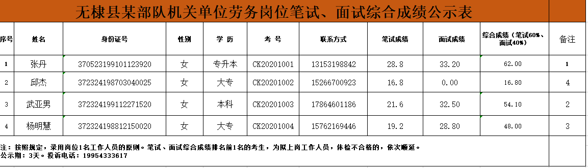 无棣县某部队机关单位劳务岗位笔试、面试综合