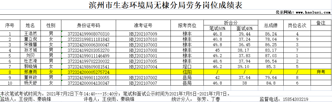 滨州市生态环境局无棣分局劳务岗位成绩公示