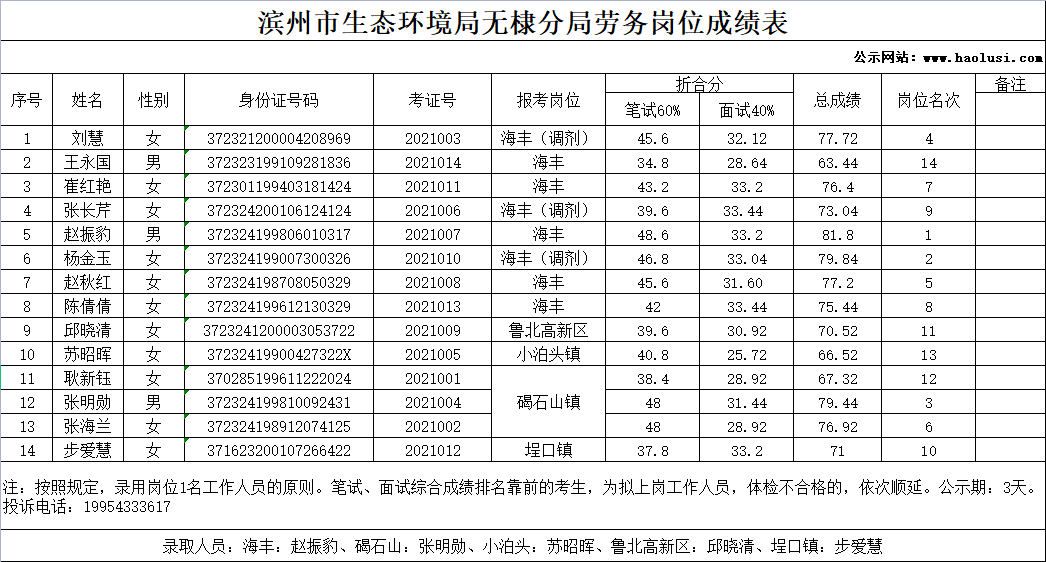 滨州市生态环境局无棣分局劳务岗位成绩表