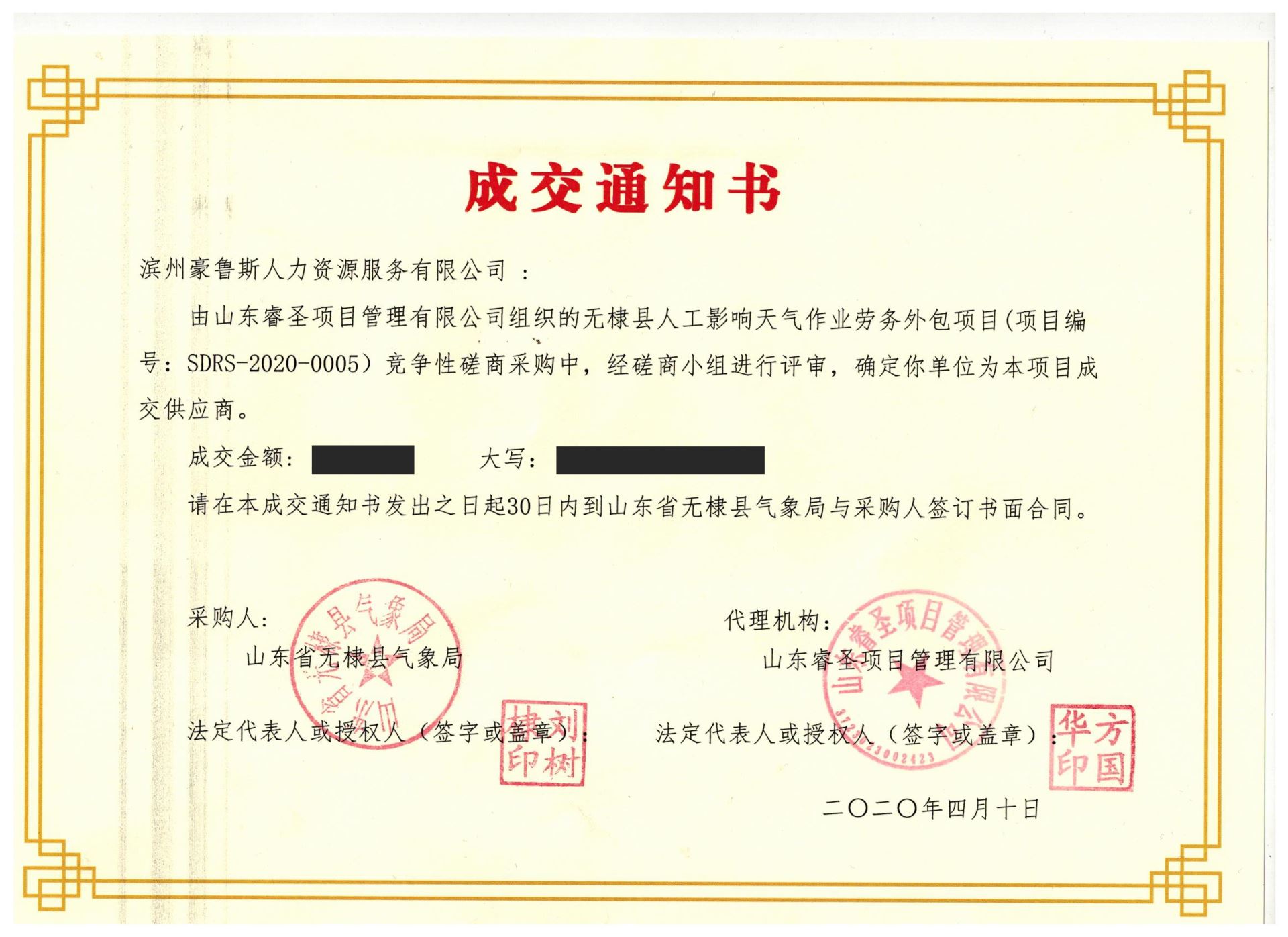 恭喜滨州豪鲁斯人力资源服务有限公司中标无棣县气象局人工影响天气作业劳务外包项目! 无棣县气象局隶属滨州市气象局和无棣县人民政府双重...